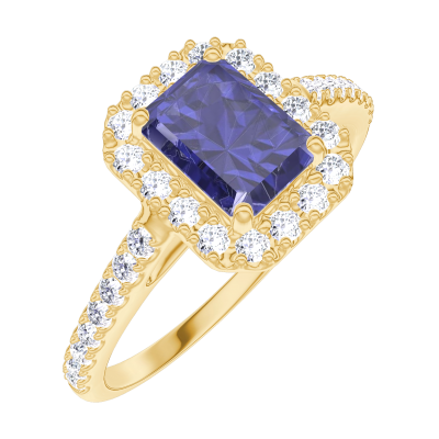 « L'ATELIER » N. 170678Anello Oro giallo 9 carati - Zaffiro blu Rettangolo 0.5 Carati - Halo Diamante - Incastonatura Diamante 4.9