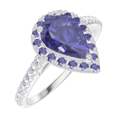 « L'ATELIER » N. 170808Anello Oro bianco 9 carati - Zaffiro blu Goccia 0.5 Carati - Halo Zaffiro blu - Incastonatura Diamante 5