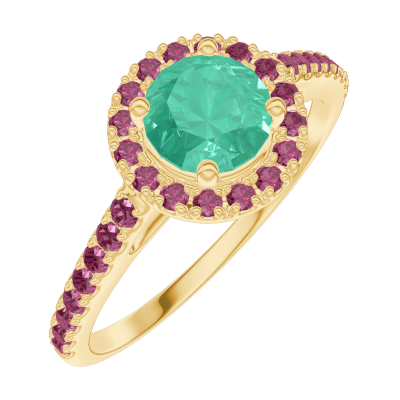 « L'ATELIER » Nº170889Anello Oro giallo 18 carati - Smeraldo Rotonda 0.5 Carati - Halo Rubino - Incastonatura Rubino 5