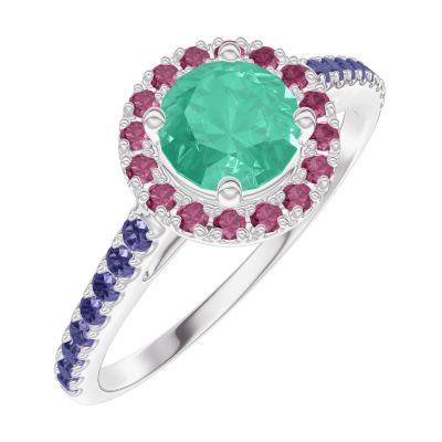 « L'ATELIER » Nº170896Anello Oro bianco 9 carati - Smeraldo Rotonda 0.5 Carati - Halo Rubino - Incastonatura Zaffiro blu 5