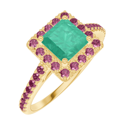 « L'ATELIER » Nº170938Anello Oro giallo 9 carati - Smeraldo Principessa 0.5 Carati - Halo Rubino - Incastonatura Rubino 4.6