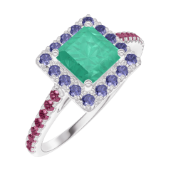Anello Oro bianco 18 carati - Smeraldo Principessa 0.5 Carati - Halo Zaffiro blu - Incastonatura Rubino