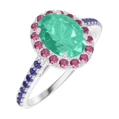Anello Oro bianco 9 carati - Smeraldo Ovale 0.5 Carati - Halo Rubino - Incastonatura Zaffiro blu