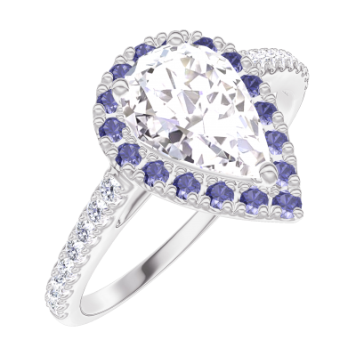 « L'ATELIER » N. 190232Anello Oro bianco 9 carati - Diamante di laboratorio Goccia 0.5 Carati - Halo Zaffiro blu - Incastonatura Diamante di laboratorio 5