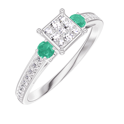 « L'ATELIER » N. 209787Anello Oro bianco 18 carati - Cluster di diamanti naturali Principessa equivalente 0.5 - Pietre laterali Smeraldo - Incastonatura Diamante