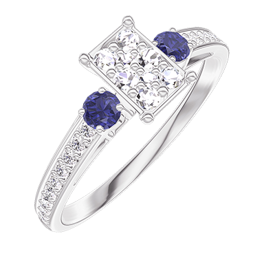 « L'ATELIER » N. 209867Anello Oro bianco 18 carati - Cluster di diamanti naturali Rettangolo equivalente 0.5 - Pietre laterali Zaffiro blu - Incastonatura Diamante