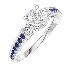 Anello Oro bianco 9 carati - Cluster di diamanti naturali Rotonda equivalente 0.7 - Pietre laterali Diamante - Incastonatura Zaffiro blu