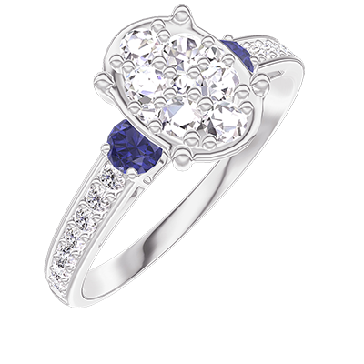 « L'ATELIER » Nº211168Anello Oro bianco 9 carati - Cluster di diamanti naturali Ovale equivalente 1 - Pietre laterali Zaffiro blu - Incastonatura Diamante 4.8