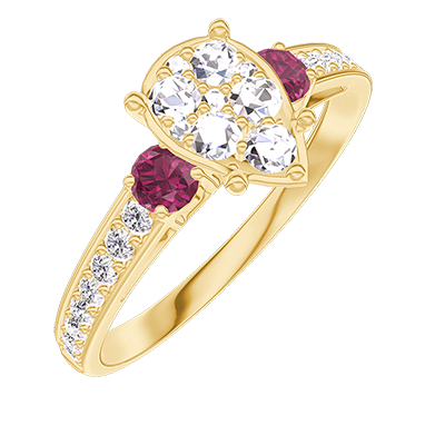 « L'ATELIER » Nº211246Anello Oro giallo 9 carati - Cluster di diamanti naturali Goccia equivalente 1 - Pietre laterali Rubino - Incastonatura Diamante
