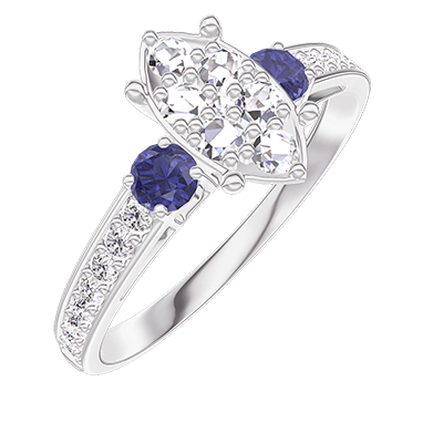 « L'ATELIER » N. 211368Anello Oro bianco 9 carati - Cluster di diamanti naturali Marchesa equivalente 1 - Pietre laterali Zaffiro blu - Incastonatura Diamante