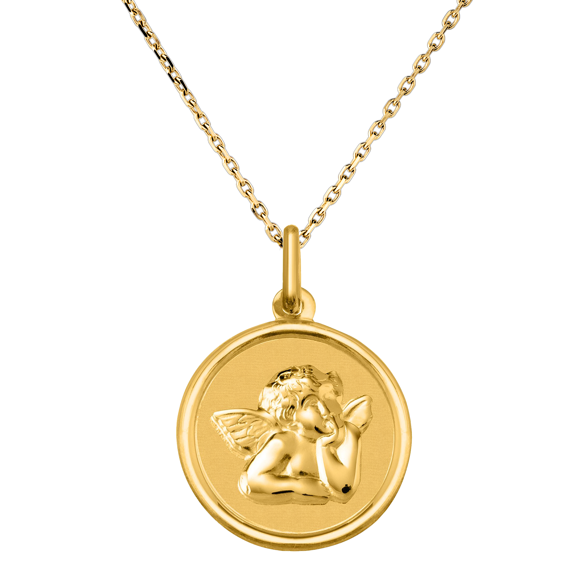 Simbolo di protezione e benevolenza, questa medaglia raffigura l’Angelo Raffaele in una posa contemplativa ispirata all’arte classica.