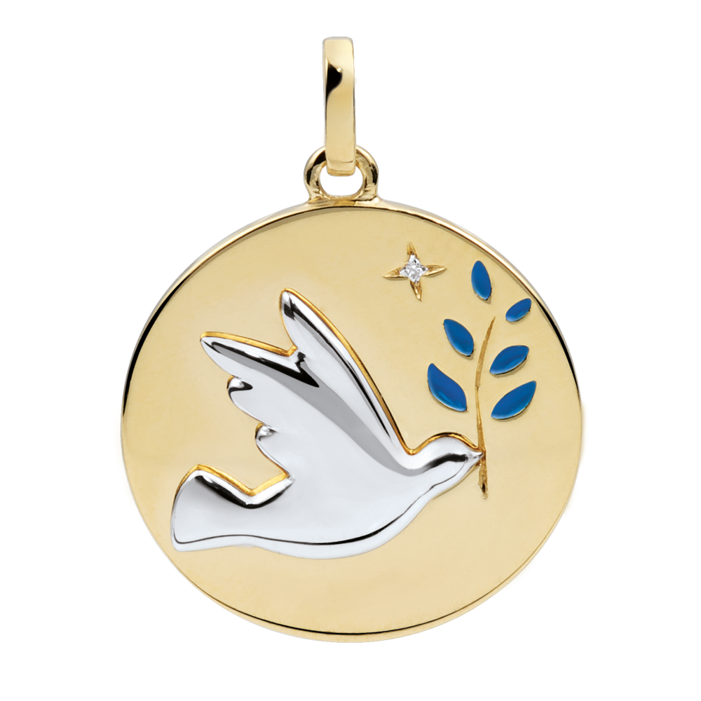 Medaglia Colomba con ramoscello - Oro bianco e Oro giallo - 18 carati - Lacca blu - 1 Diamante