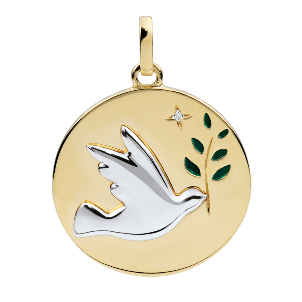 Medaglia Colomba con ramoscello - Oro bianco e Oro giallo - 9 carati - Lacca verde - 1 Diamante