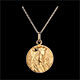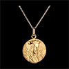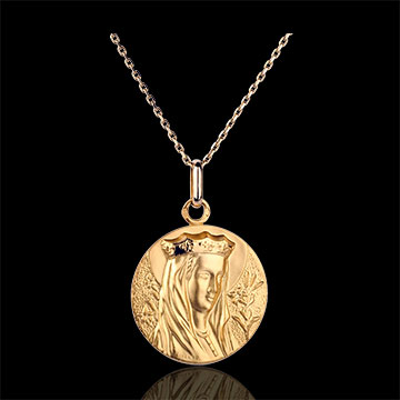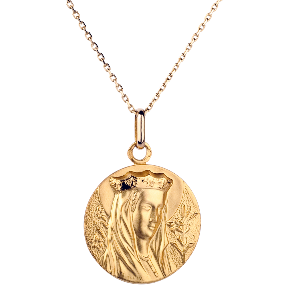 La Vergine Maria con il velo e la corona è raffigurata su una medaglietta in Oro giallo lavorata finemente.