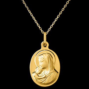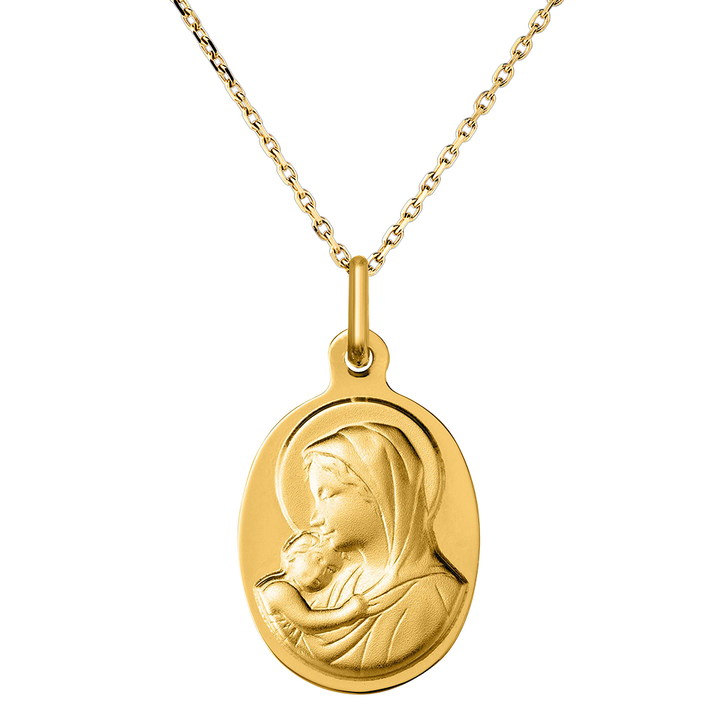 Questa medaglia in oro giallo cattura la tenerezza tra la Vergine Maria e il Bambino Gesù. Il gesto dolce della Vergine, chinata sul suo bambino, incarna l'amore materno e la purezza divina. Un gioiello che simboleggia serenità e protezione, perfetto per segnare momenti spirituali come un battesimo o una comunione.