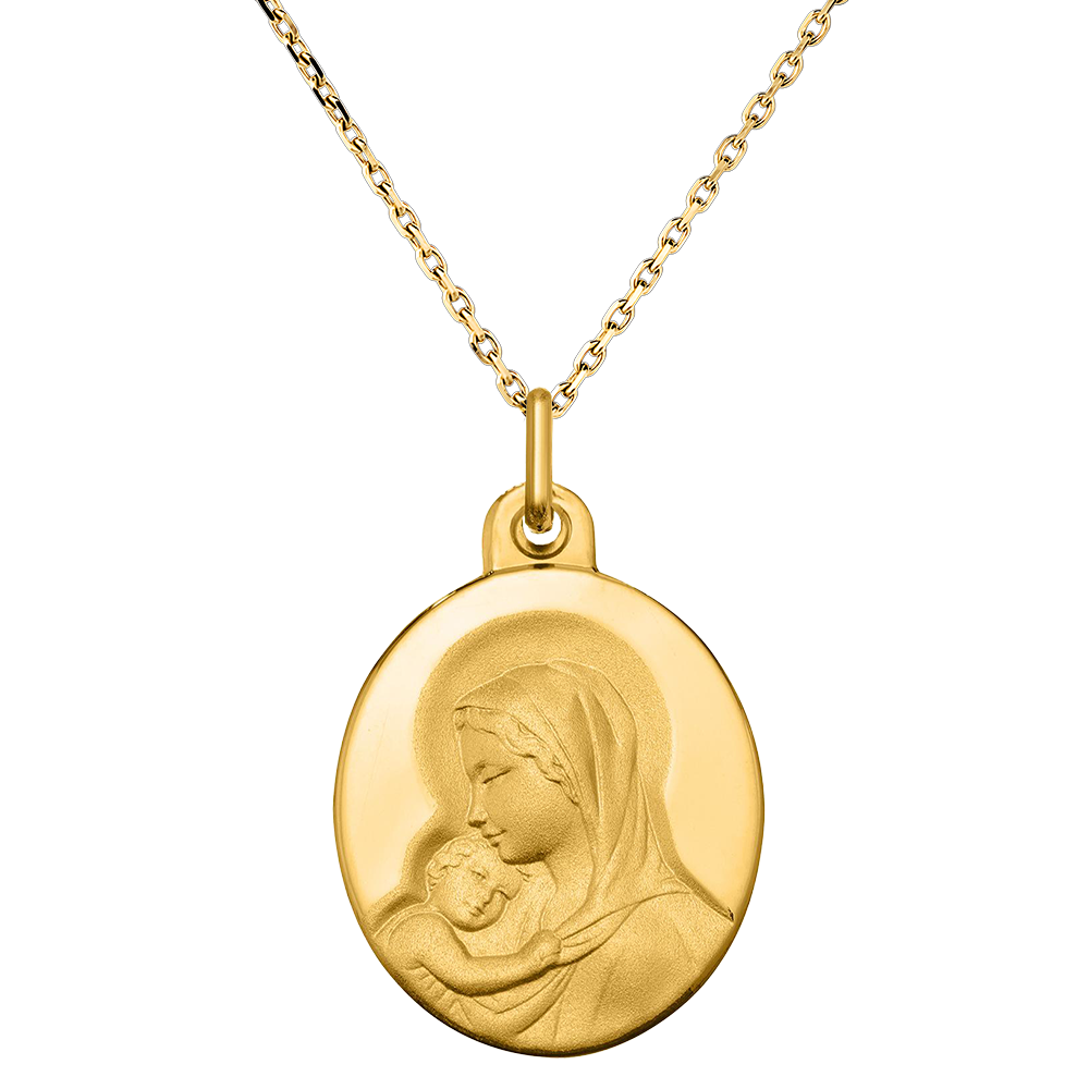 Questa medaglia in oro giallo cattura la dolcezza dell'istante in cui la Vergine Maria tiene affettuosamente tra le braccia il Bambino Gesù. La semplicità di questa scena evoca amore sconfinato e benevolenza materna. Il rilievo sottile e la finitura raffinata rendono omaggio a un legame sacro, quello della maternità e della protezione divina. Questo gioiello invita alla serenità e alla riflessione, ideale per commemorare un'occasione spirituale significativa come un battesimo o una comunione.