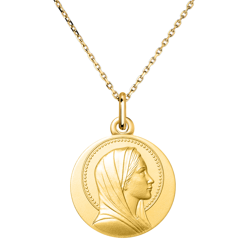 Questa medaglia in oro giallo raffigura un elegante profilo della Vergine Maria, emanando serenità. Il suo viso dolce, incorniciato da un'aureola finemente dettagliata, evoca la purezza e protezione divina che avvolgono chi la indossa. Un gioiello sottile ma potente, perfetto per qualsiasi occasione spirituale, che sia un battesimo, una comunione o semplicemente per avvicinarsi alla luce divina.