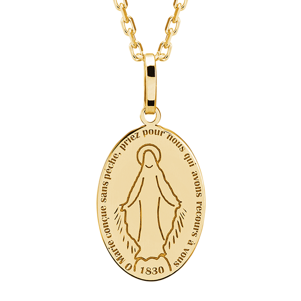 Parte della Collezione Origine, questa medaglietta ovale simboleggia fede e protezione, perfetta come regalo per nascita, battesimo o comunione.