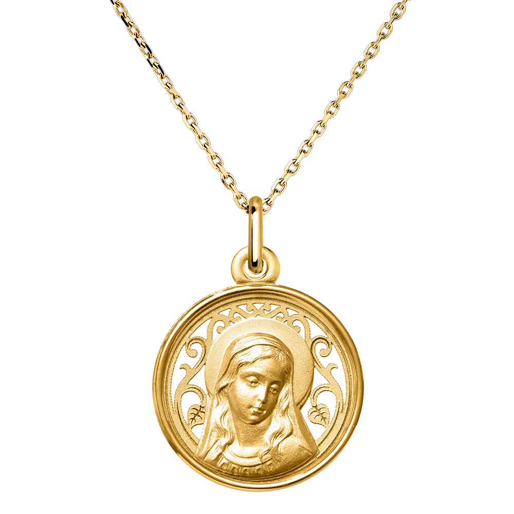 Questo squisito medaglione in oro giallo presenta un elegante profilo della Vergine Maria, circondato da un delicato design traforato che ne accentua la purezza e la grazia. La luce che attraversa i motivi intricati intorno alla sua immagine esalta la bellezza del volto di Maria, conferendo a questo medaglione un carattere unico. Simbolo di fede e protezione divina, questo gioiello è un regalo perfetto per occasioni spirituali come battesimi o comunioni, o semplicemente come talismano protettivo quotidiano.