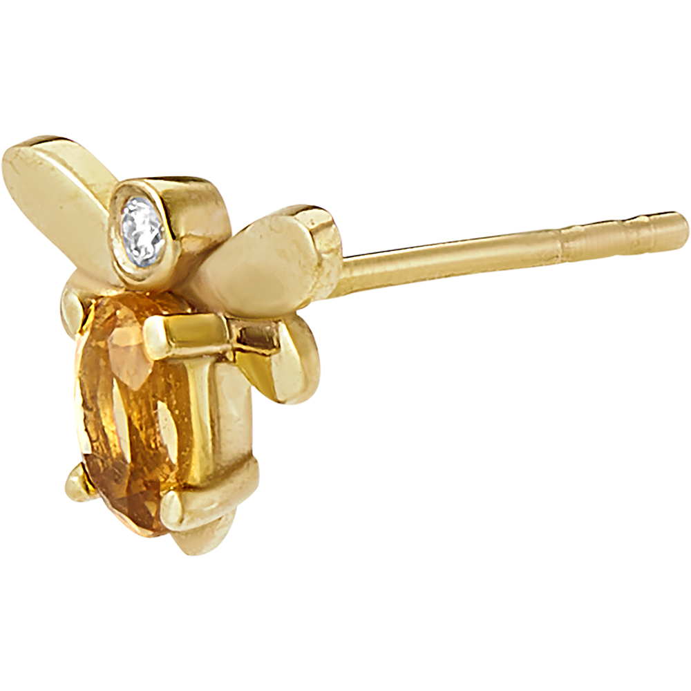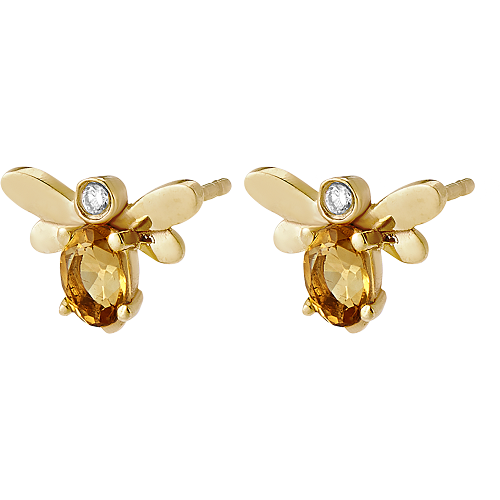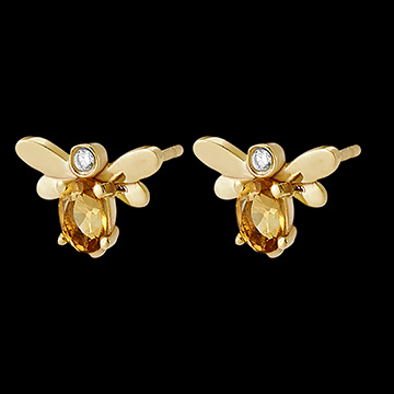 Gli orecchini Ape Pop in oro giallo simboleggiano l'ape regina. Orecchini a lobo in oro giallo sui quali sono delicatamente posate delle api il cui corpo è composto da citrino ovale di 4 x 3 mm e da diamanti sintetici.