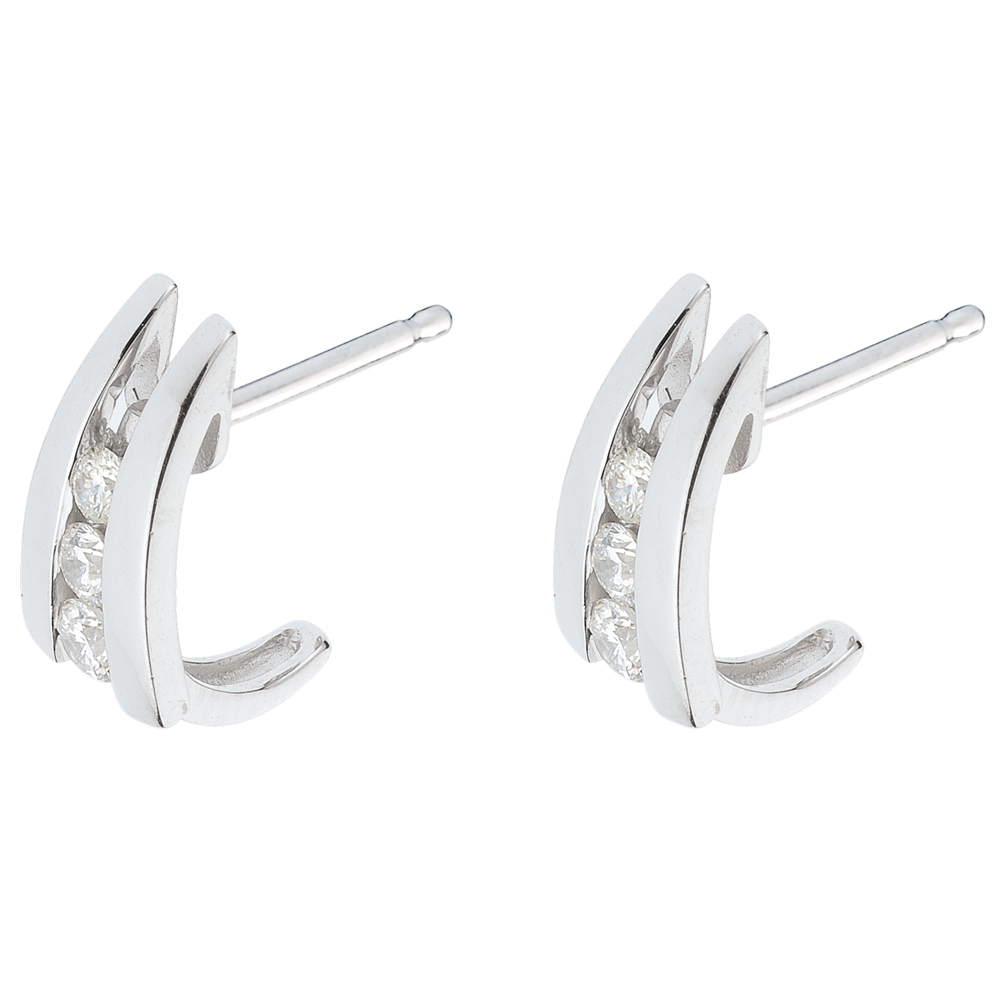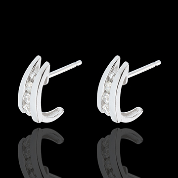 Una coppia di orecchini in Oro bianco con trilogia di diamanti dalla forma ricurva, per aggrapparsi all'amore.