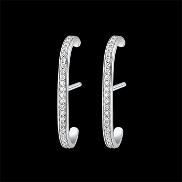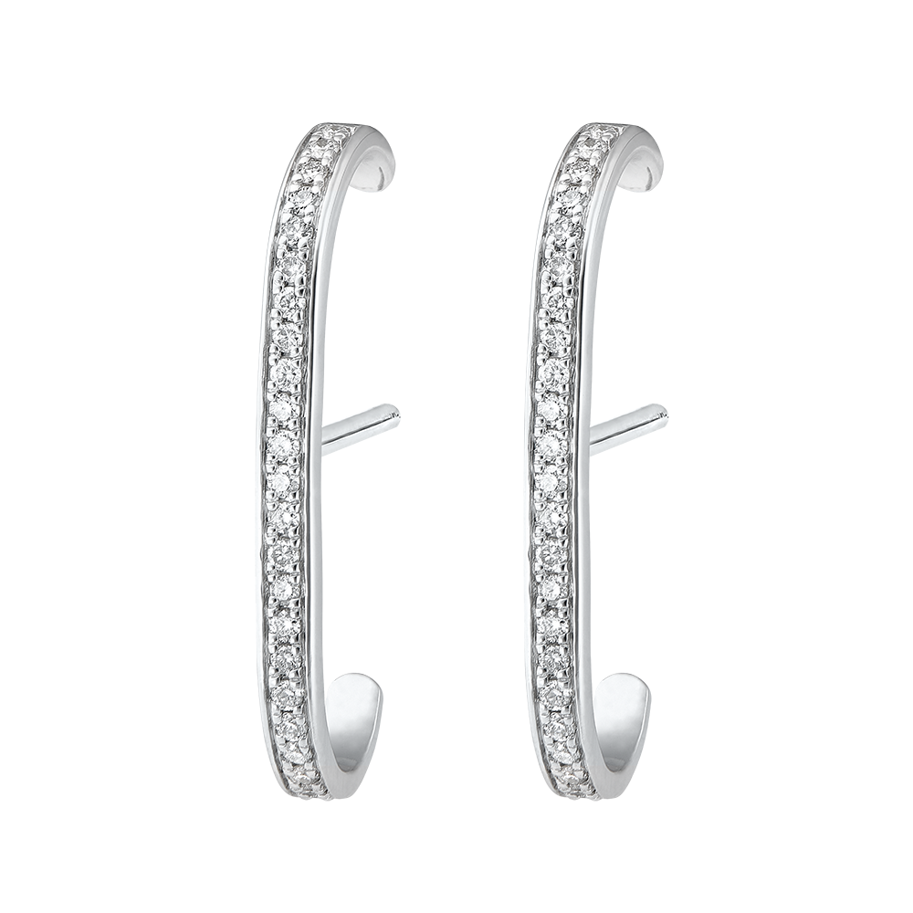 Un paio di orecchini in oro bianco con pavé di diamanti, un modello dalla forma che si allunga come una scia luccicante.