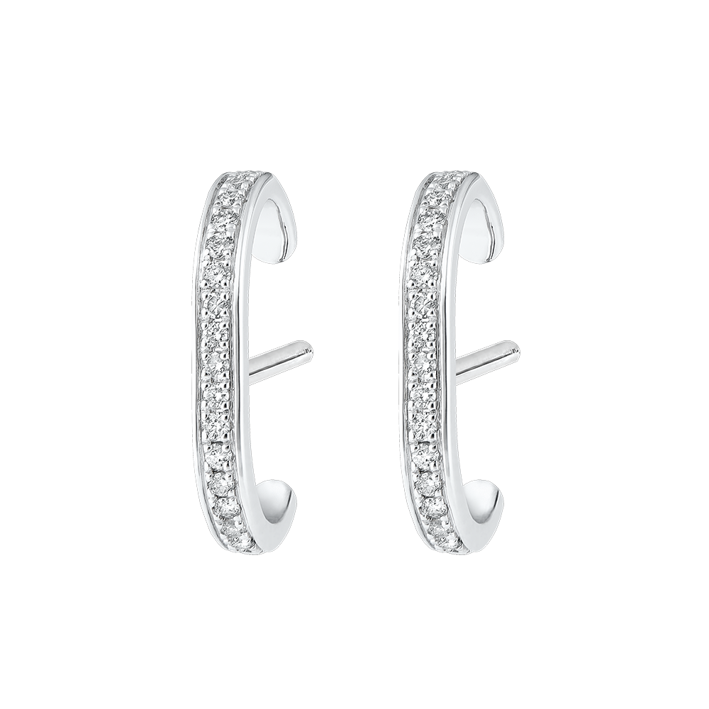 Un paio di orecchini in oro bianco con pavé di diamanti, un modello dalla forma che si allunga come una scia luccicante.