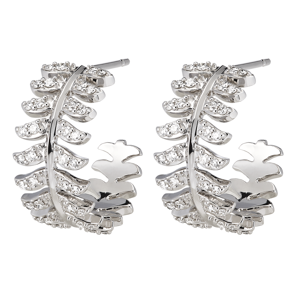 Gli orecchini a cerchio Révérence in oro bianco 9 carati si distinguono per il loro motivo di piuma circolare delicatamente incastonato con 72 diamanti sintetici. Riflettendo lo spirito maestoso della collezione Panache, gli orecchini catturano la luce con grazia, aggiungendo un tocco spettacolare a qualsiasi abbigliamento.