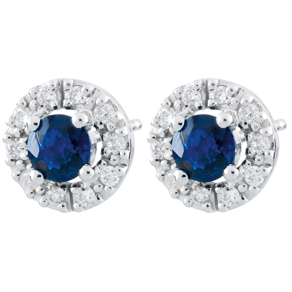 Una coppia di eleganti orecchini rotondi in Oro bianco e diamanti custodisce al centro un prezioso zaffiro.