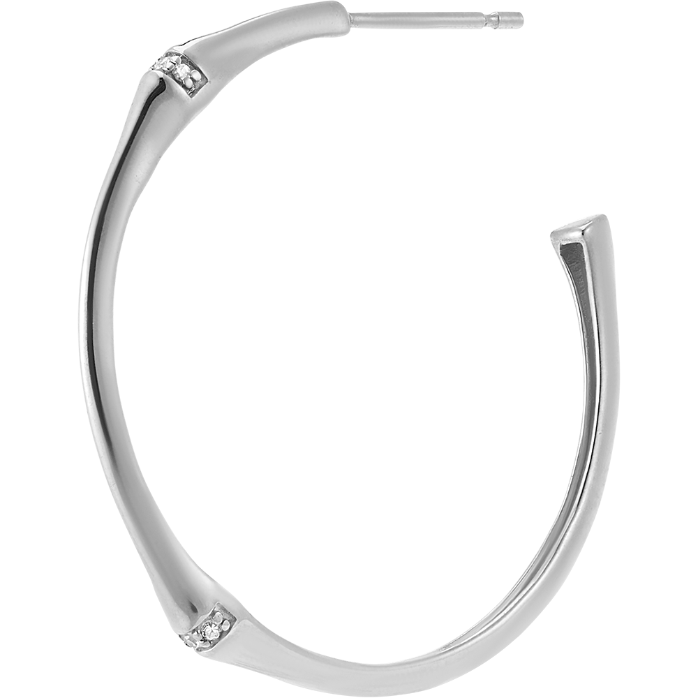 Un ramo di bambù solido e flessibile si trasforma in una coppia di orecchini creoli dal fascino eterno. Diametro 30 mm. I nodi del bambù sono impreziositi da diamanti.
