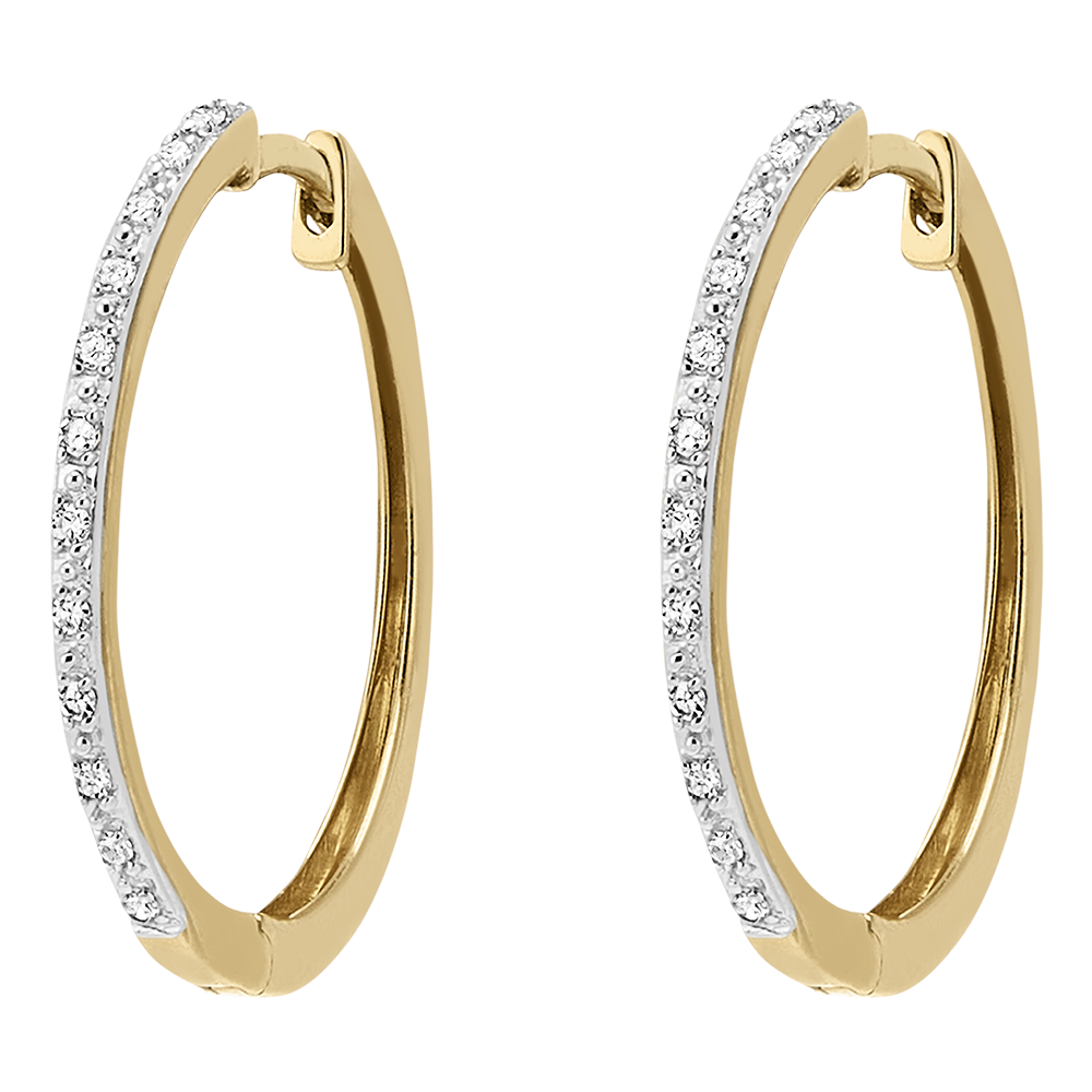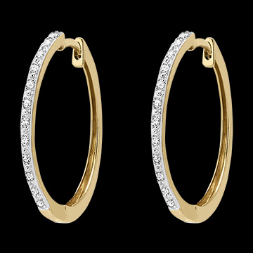 Una coppia di orecchini creoli in oro giallo semi pavé, per un tocco di luce e di modernità. Diametro cerchio 18mm.