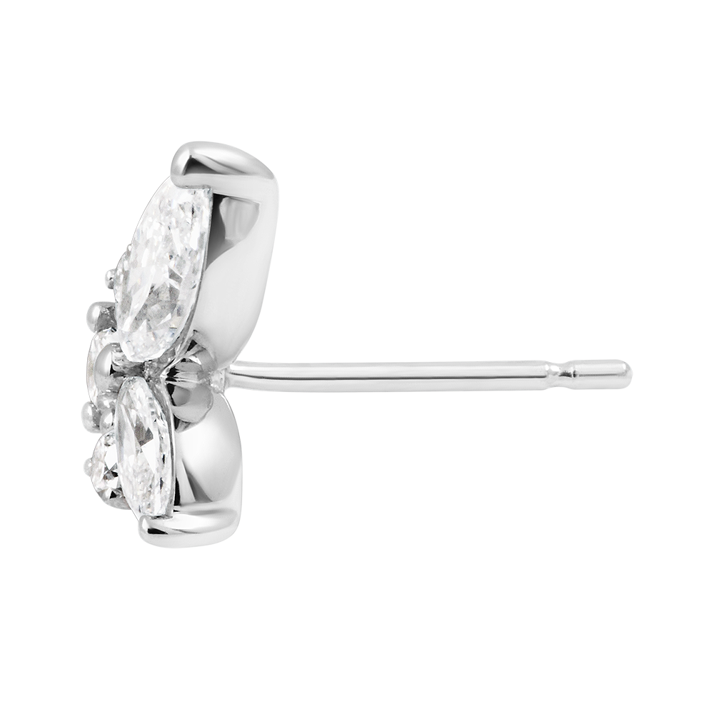 Gli orecchini "Farfalla di Mezzanotte" in oro bianco 9 carati sono impreziositi da 10 diamanti sintetici taglio marquise e rotondo, disposti a formare una delicata farfalla.