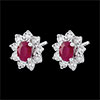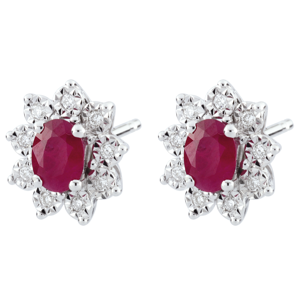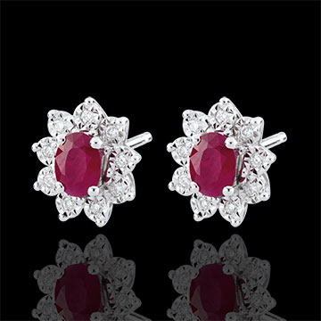 Su ogni orecchino, un rubino ovale diviene il centro di un fiore creato in Oro bianco con i petali tempestati di diamanti.