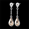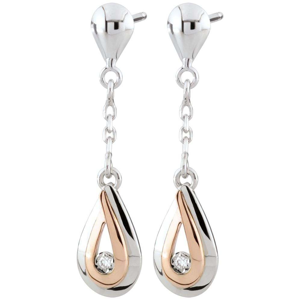Due magiche gocce in Oro rosa e Oro bianco impreziosite da un diamante per una coppia di pendenti leggeri e femminili .