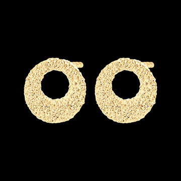 Un paio di orecchini a lobo in oro giallo decisamente moderni. Ornati con un cerchio d'oro testurizzato - effetto diamante. Colpo di fulmine garantito.