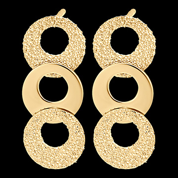 Un paio di orecchini a lobo in oro giallo decisamente moderni. Ornati con un motivo di 3 cerchi assemblati, due in oro testurizzato - effetto diamante - e uno lucidato. Colpo di fulmine garantito.