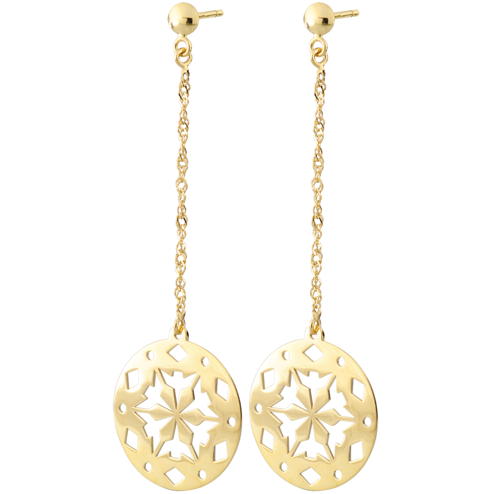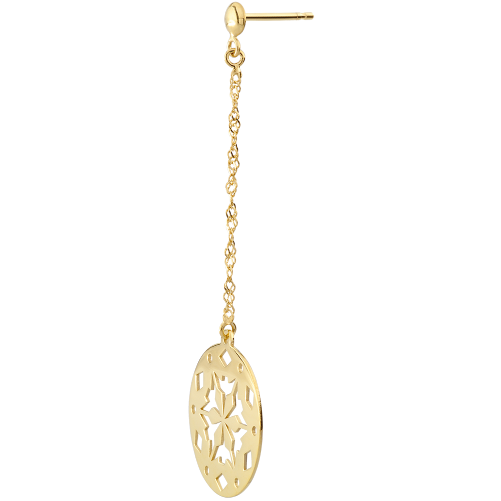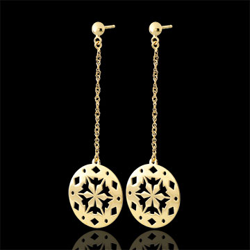Un motivo floreale che richiama la trama di un tessuto etnico è intagliato in due dischi d'Oro, sospesi a un sottile filo sempre in Oro giallo.