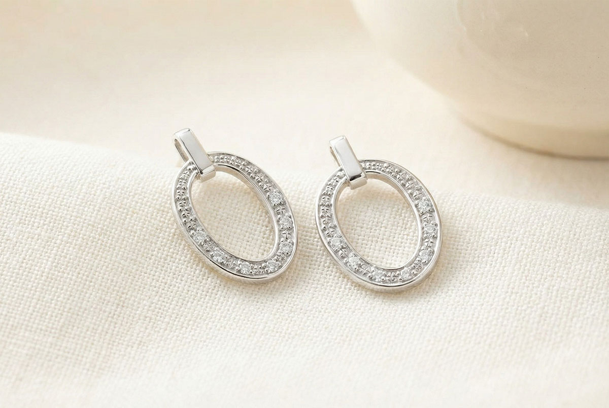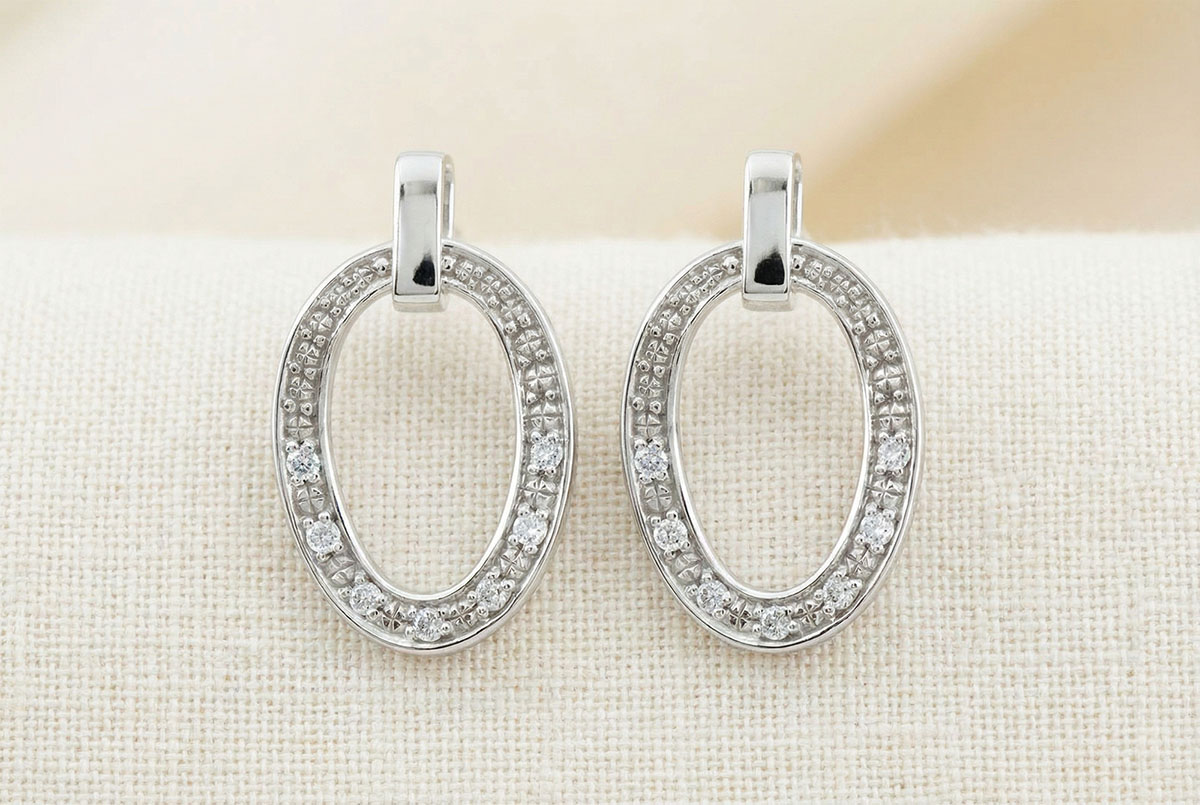 Due moderni orecchini in Oro bianco dalla forma ovale, con preziosi dettagli in diamanti.