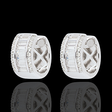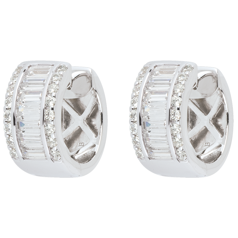 Tre file di diamanti, brillanti e baguette per un effetto ricco e lussuoso su Oro bianco.