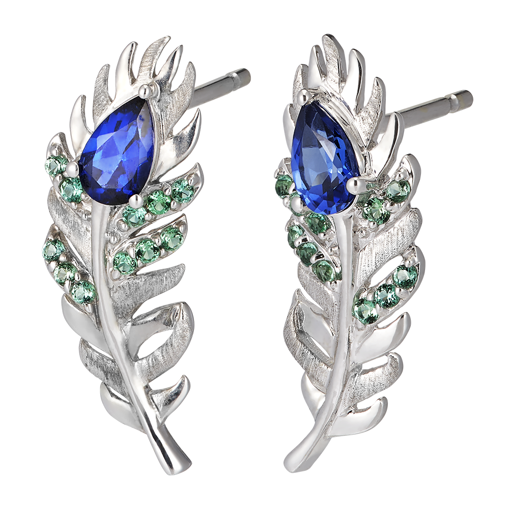 Gli orecchini Altesse incarnano un'eleganza raffinata. In oro bianco 9 carati, sono magnificamente ornati con 24 smeraldi e zaffiri sintetici, di cui 2 zaffiri di 0,25 carati a forma di pera. Ogni dettaglio di questi orecchini riflette lo splendore delle piume, firma della collezione Panache.