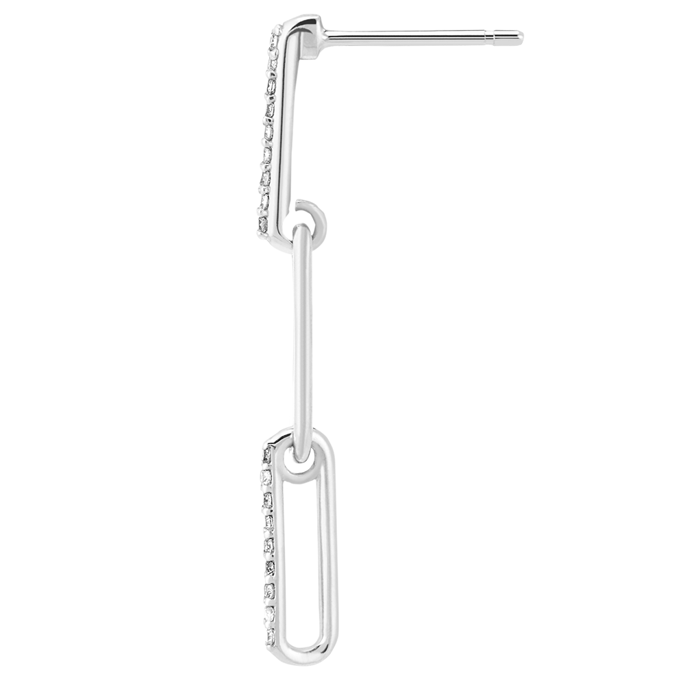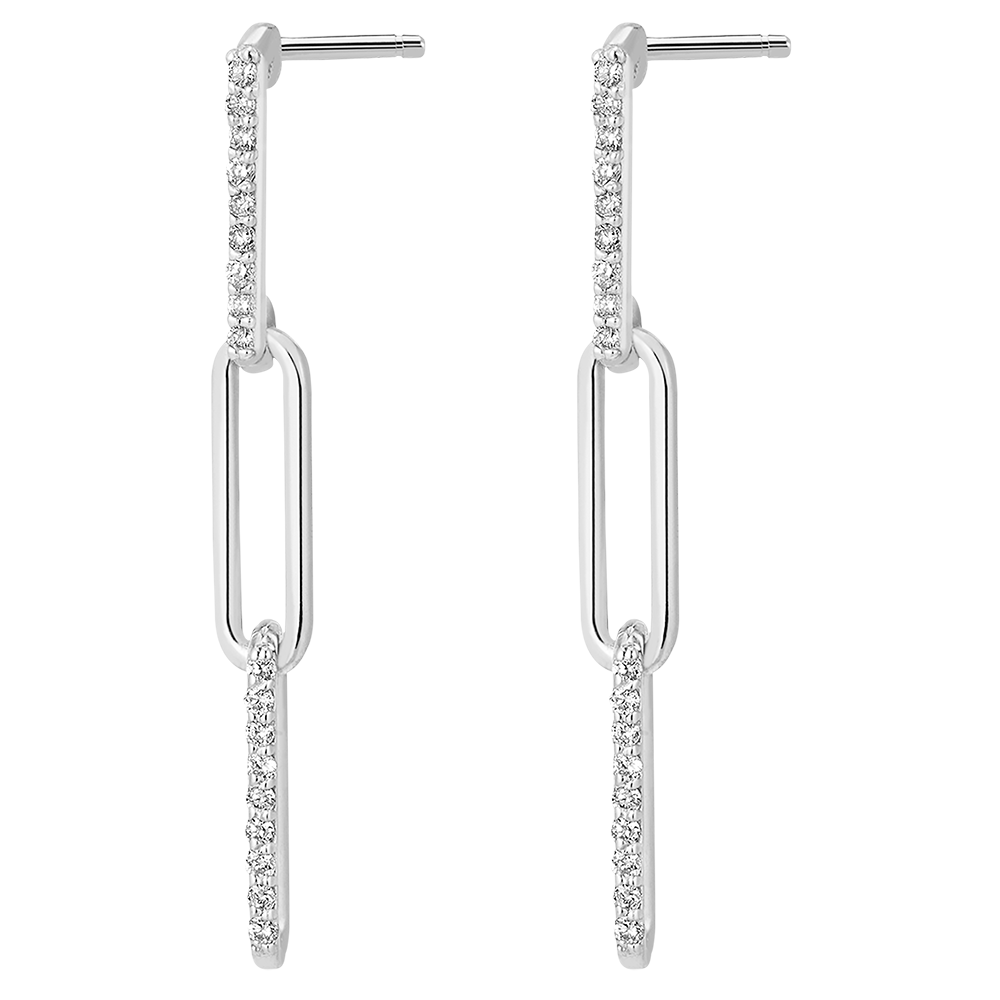 Un trio di maglie in oro bianco delicatamente diamantate ondeggiano con eleganza. Una coppia di orecchini pendenti moderni e femminili