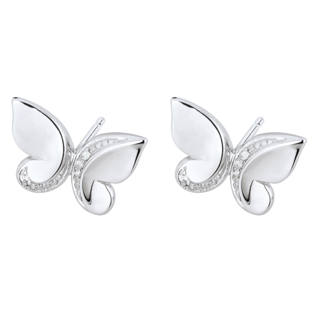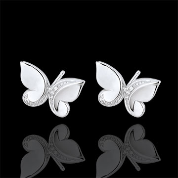 Due graziose farfalle in Oro bianco e diamanti si trasformano in parure.< br>Orecchini a lobo.< br>Diamante: 0.03 carati - Oro bianco (18 carati = 750/-): 1.45 g.