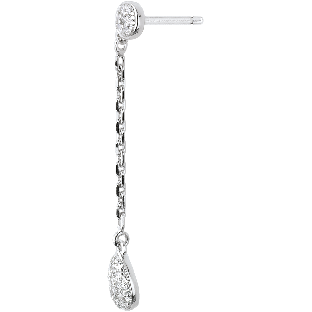 Una coppia di orecchini pendenti in oro bianco pavé leggeri e femminili.