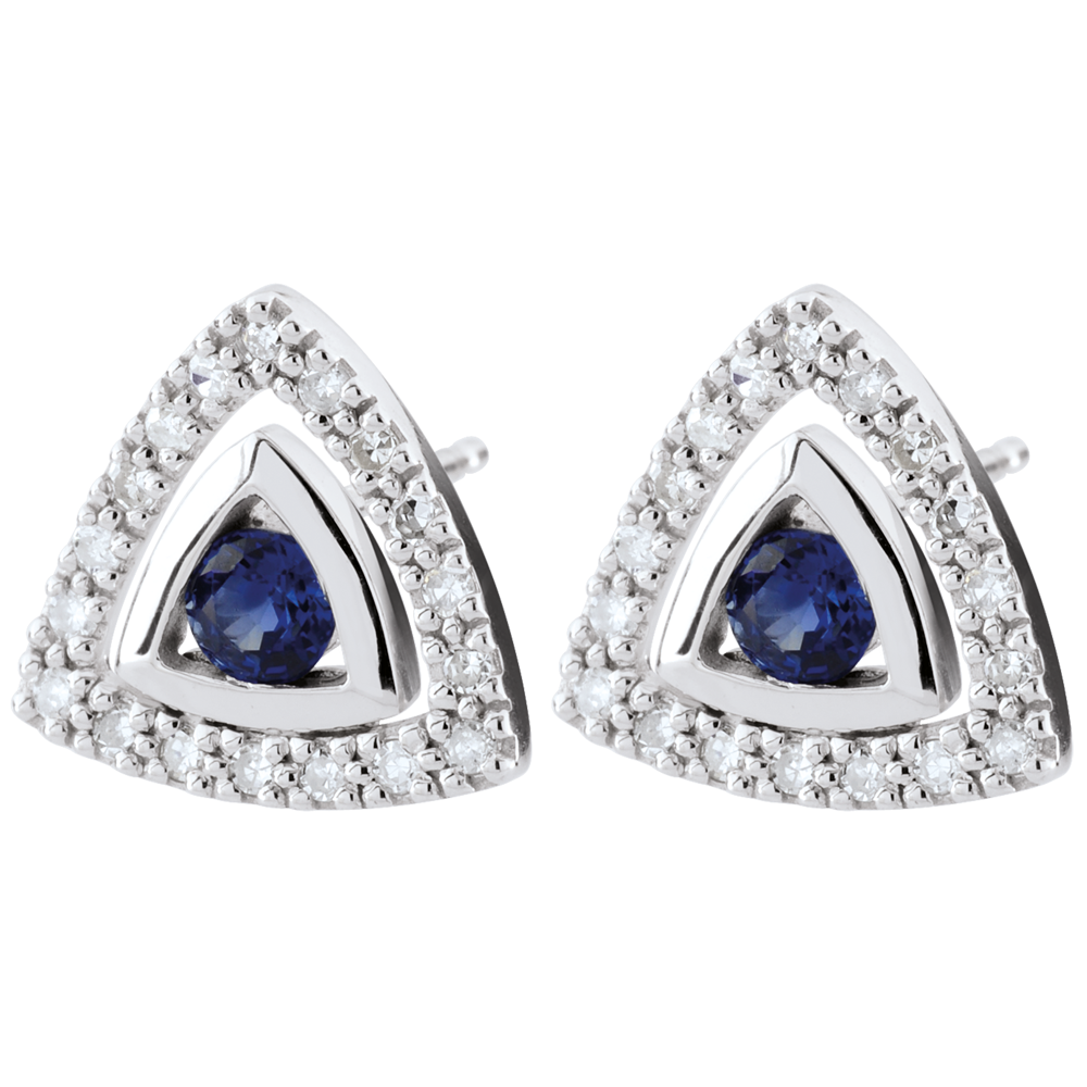 Scoprite l'eleganza raffinata degli orecchini Salma, composti da due triangoli in oro bianco 9 carati finemente pavé di 36 diamanti. Ogni triangolo ospita uno zaffiro blu di alta qualità, che dona un tocco di colore e raffinatezza.