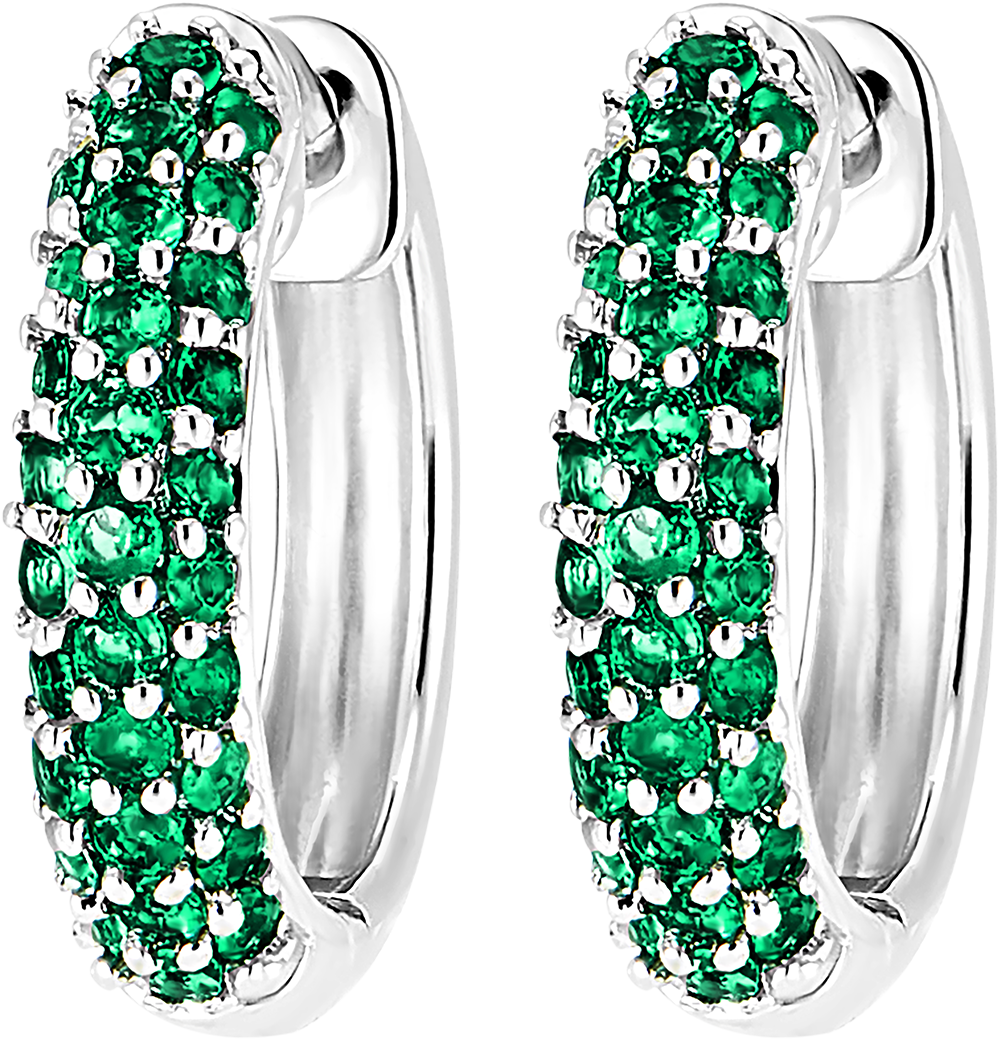 Un paio di oreccchini creoli in oro bianco impreziositi da 62 smeraldi delicati disposti su tre file. Un gioiello classico e senza tempo, con un tocco di colore.