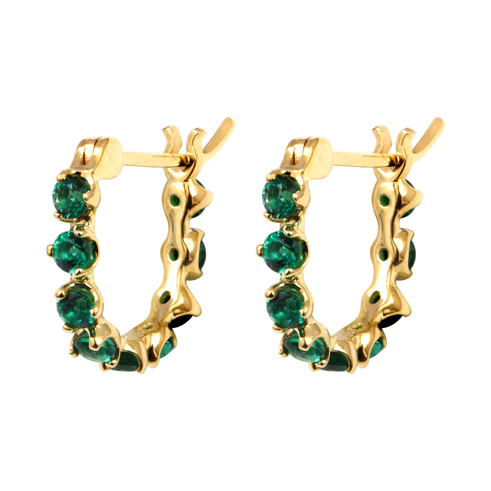 Questi orecchini a cerchio in oro giallo 9 carati sono impreziositi da un pavé di smeraldi sintetici che dona una luminosità verde vibrante. Aggiungono un tocco prezioso e naturale al tuo stile.