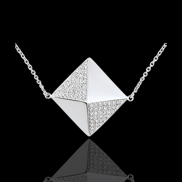 Una collana che omaggia la forma a ottaedro originaria del diamante grezzo, declinandola in Oro e in un pavé di diamanti. Lunghezza: 90cm