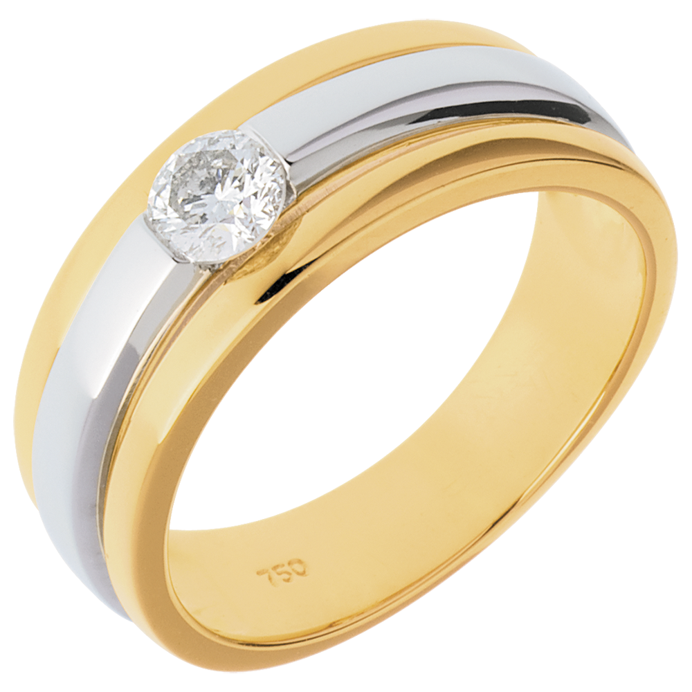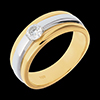 Un anello moderno e luminoso, sottolineato dall'unione di due Ori e coronato da un diamante solitario.