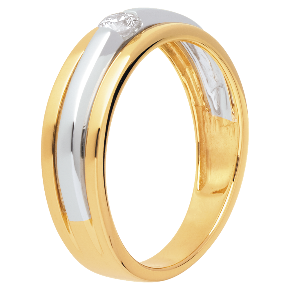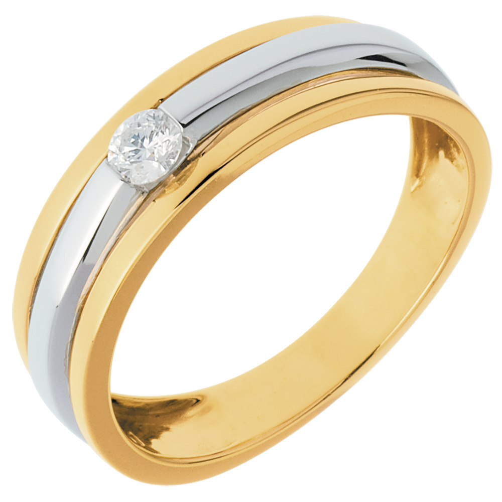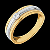 Un anello moderno e luminoso, sottolineato dall'unione di due Ori e coronato da un diamante solitario.