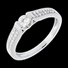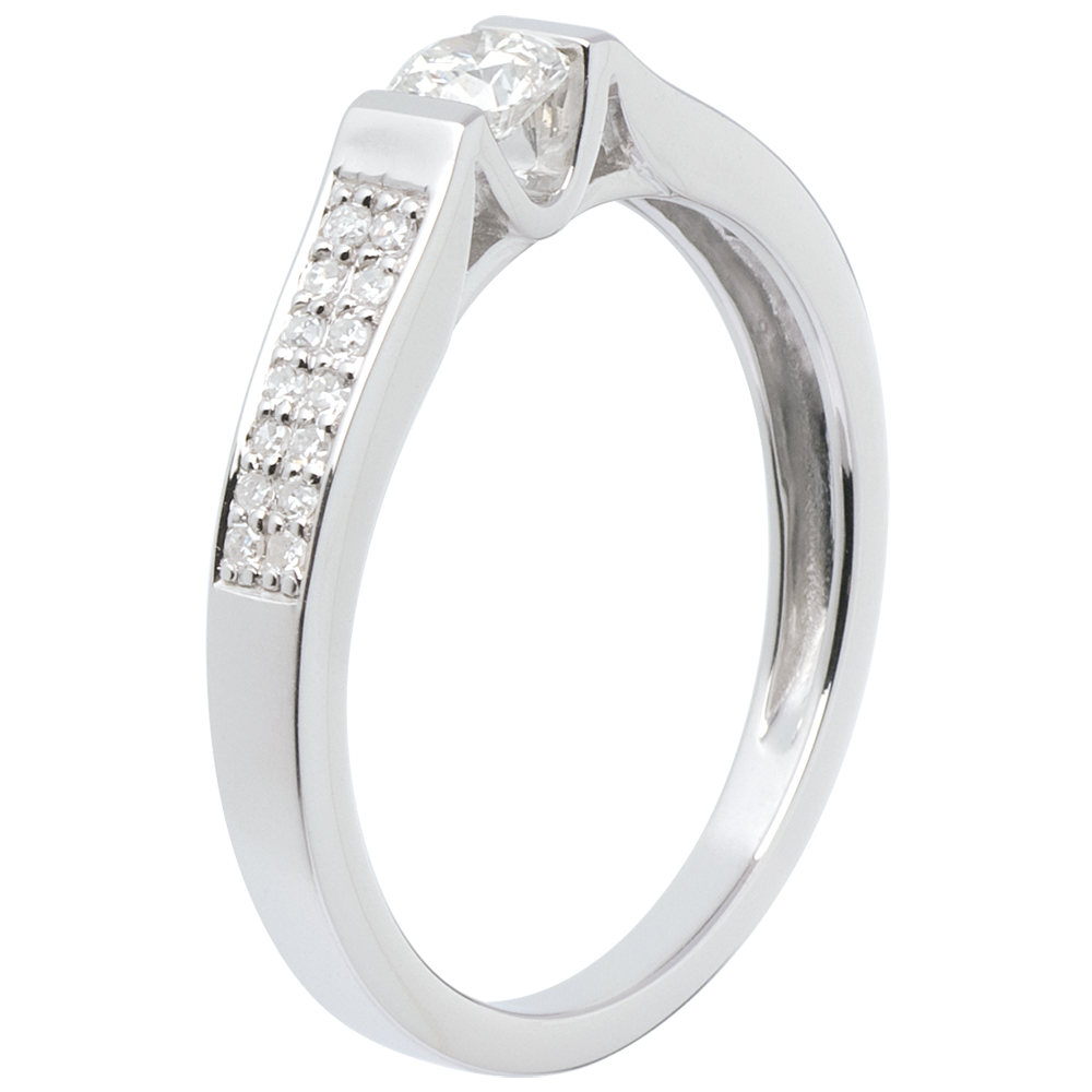 La brillantezza assoluta di un diamante al centro su una montatura grafica e contemporanea, sottolineata da un pavé di diamanti.